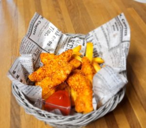 Sisältää 4 kpl friteerattuja kanan sisäfileepaloja, dipin ja ranskalaisia. (L)