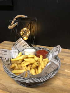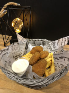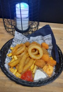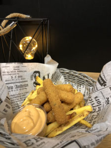 Ranskalaiset, 2kpl mozzarellatikut, 2kpl jalapenopoppers, 2kpl sipulirengas, 2kpl maissipaneroitu kananfilee + paprika- ja valkosipulidipit