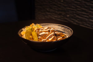 Kebab, kebab-kastike, valkosipulimajoneesi, jäävuorisalaatti, Thousand Island-kastike, turkinpippuri (G, L)