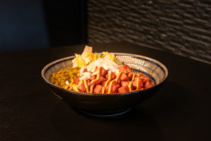 Cheddarjuustoa, paneroituja kanafileitä, jäävuorisalaattia, punasipulia, ananasta, savuchili- ja valkosipulimajoneesia (L)