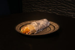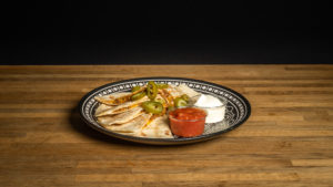 Tortillalätty, jonka välissä on cheddar-jauhelihatäyte, salsaa(L)